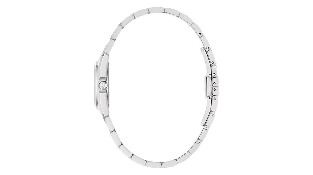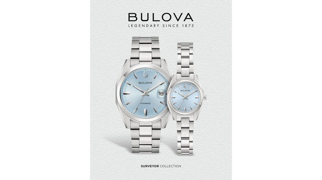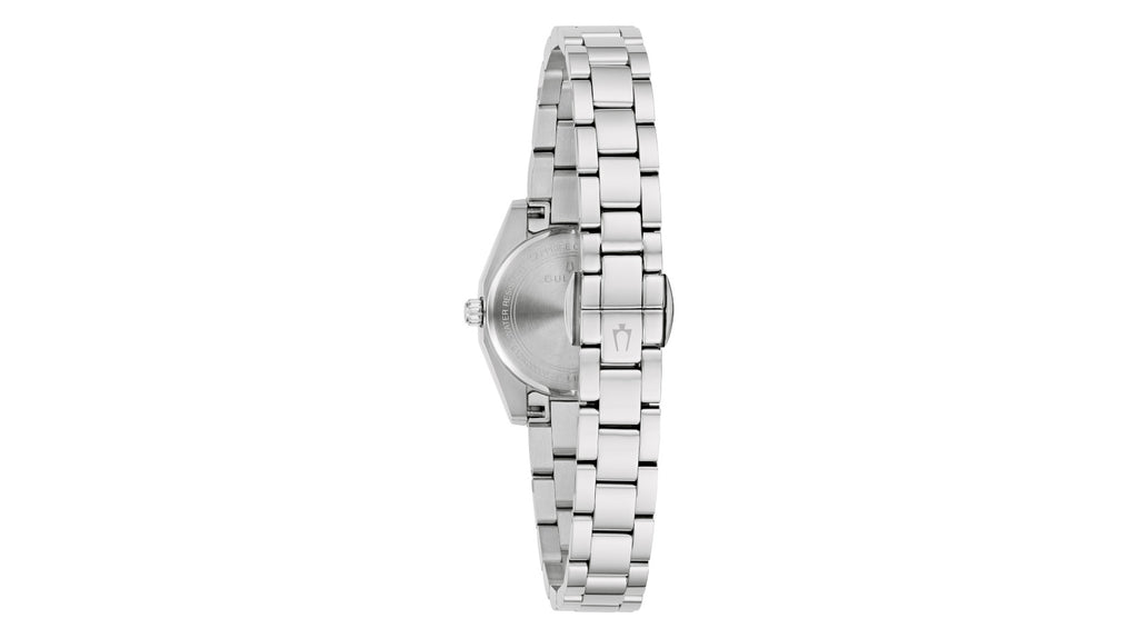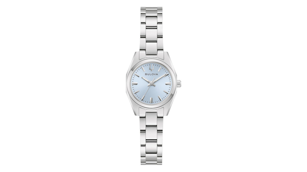 Defined by exceptional quality and sophisticated aesthetics, the Bulova ladies’ Surveyor is the quintessential modern timepiece updated with a mini 23mm case. Sculpted edges and faceting distinguish the polished silver-tone stainless steel case, with polished and brushed finishing, a flat sapphire crystal, and a matching 3-link silver-tone stainless steel bracelet with a push-button deployant clasp and easy-release latched spring bars. The radiant light blue dial has a sunburst finish and silver-tone accents and hands with luminescent fill. For those with a discerning eye for refined luxury, this Bulova women’s timepiece is the perfect everyday companion.