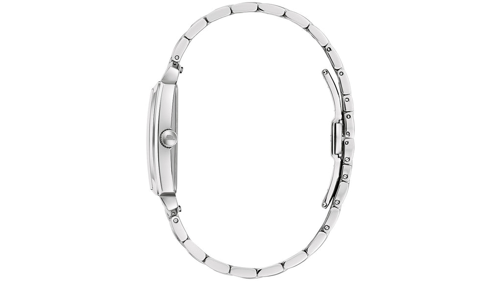 This enduring design from Bulova’s Frank Sinatra collection is inspired by classic Bulova model from the legendary crooner’s heyday. The watch features a 30mm silver-tone stainless steel case with a curved sapphire crystal with anti-reflective coating, a case back engraved with the Sinatra logo and “The Very Thought of You,” and a matching 7-row bracelet with a push-button deployant clasp. The radiant black dial is appointed with a date display and silver-tone hands and applied markers, including Sinatra’s signature fedora at 12 o’clock. As classic as Sinatra himself, this Bulova men’s watch offered in a custom Frank Sinatra box is a timeless addition with style that will last a lifetime.