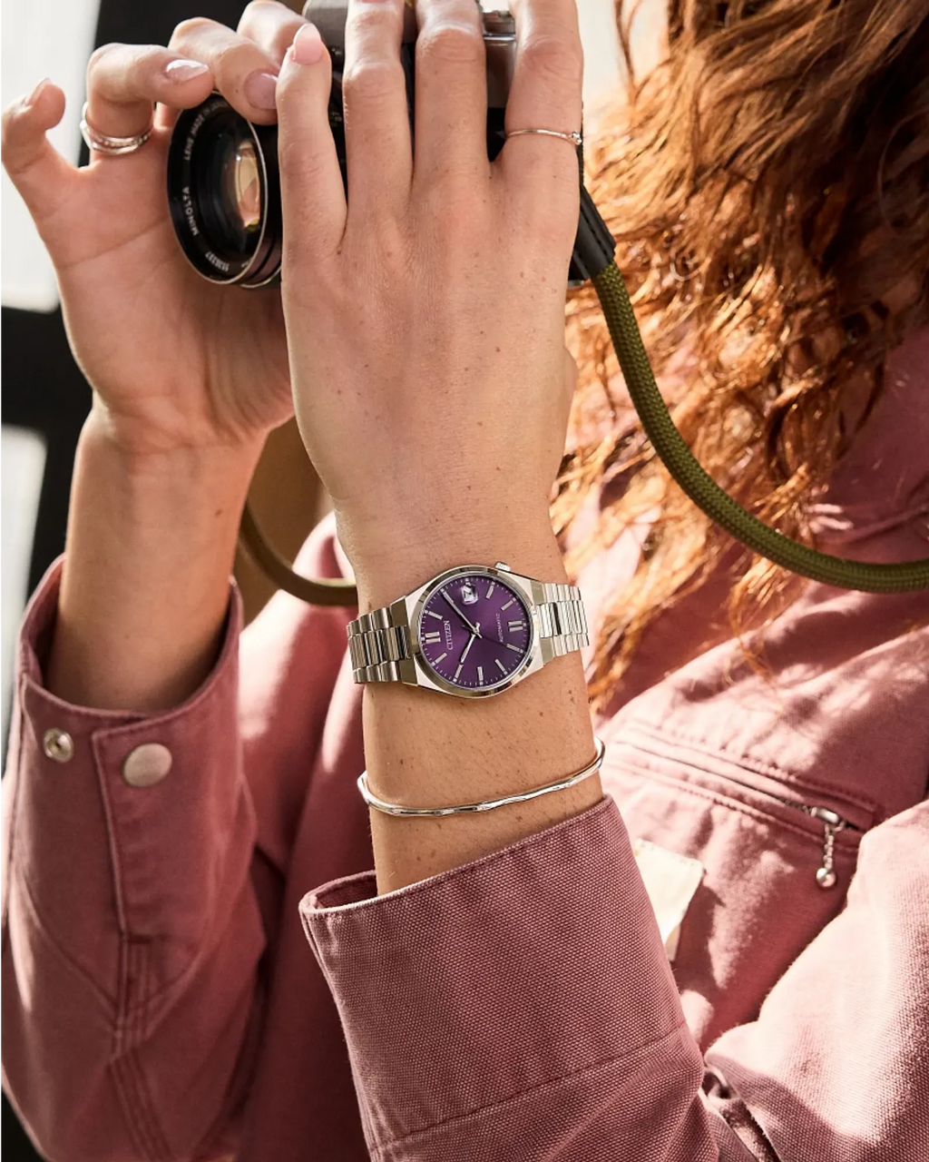 The TSUYOSA Automatic, from the NJ020 series, brings ultramodern sports styling right to your wrist. Executed in a versatile 37mm footprint, the sophisticated design of the watch delivers a strong impression via a silver-tone stainless steel case and a seamlessly integrated, matching bracelet. Underneath an anti-reflective sapphire crystal, the sporty timepiece makes use of a sunray purple dial, with a 3 o’clock date window and complementing silver-tone details adding to its eye-catching configuration. Powered by an automatic movement with a 42-hour power reserve and offering up to 50 meters of water resistance, the refined timepiece is a daily-wear choice ready for work, play, and everything in between. Caliber 8210.