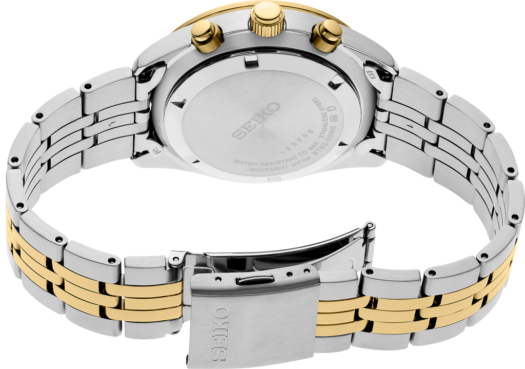 From the Essentials Collection. Inspired by motor sports, this dynamic chronograph features a black dial with bold, highly legible gold subdials at 3 and 9 o’clock styled to suggest a racecar instrument panel. Framed by a black tachymeter outer ring, the dial also offers a date calendar as well as a 24-hour subdial. The chronograph provides measurement of up to 60 minutes of elapsed time in 1/5-second increments. Crafted of stainless steel with mirror and hairline two-tone finish and tri-fold push button release clasp. 10 bar, 100M Water Resistant