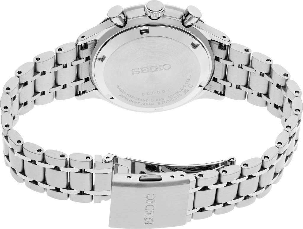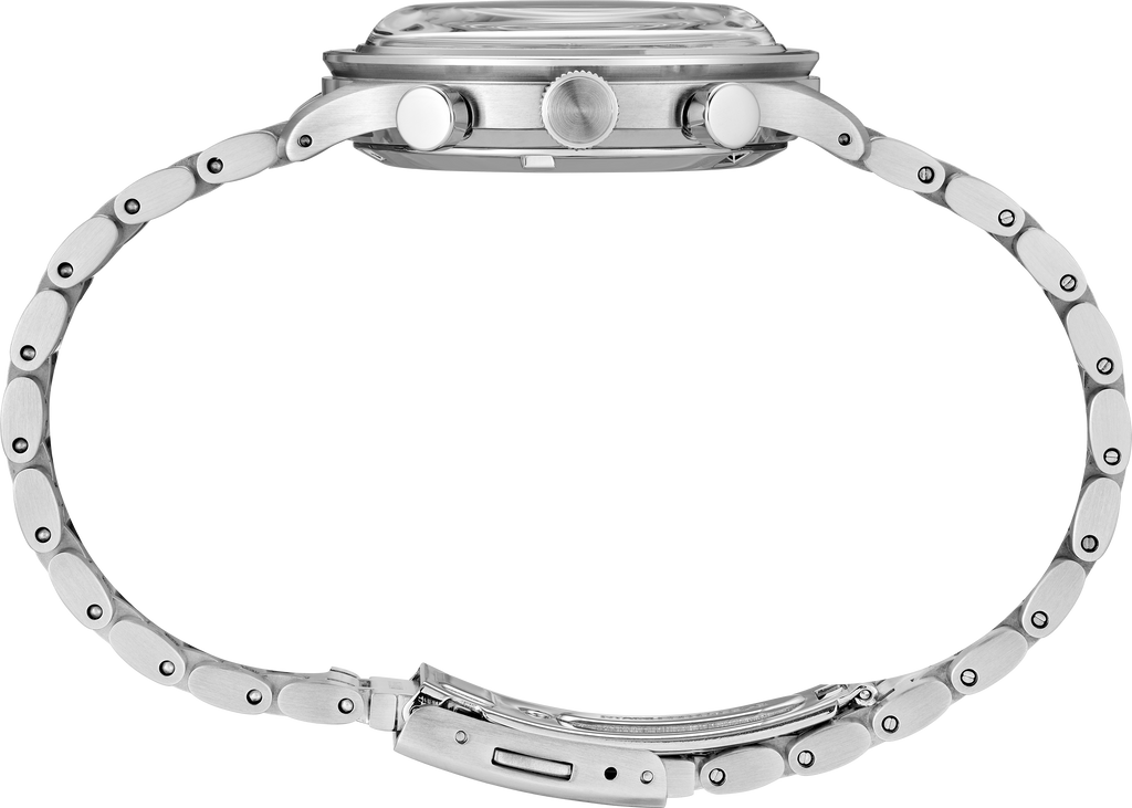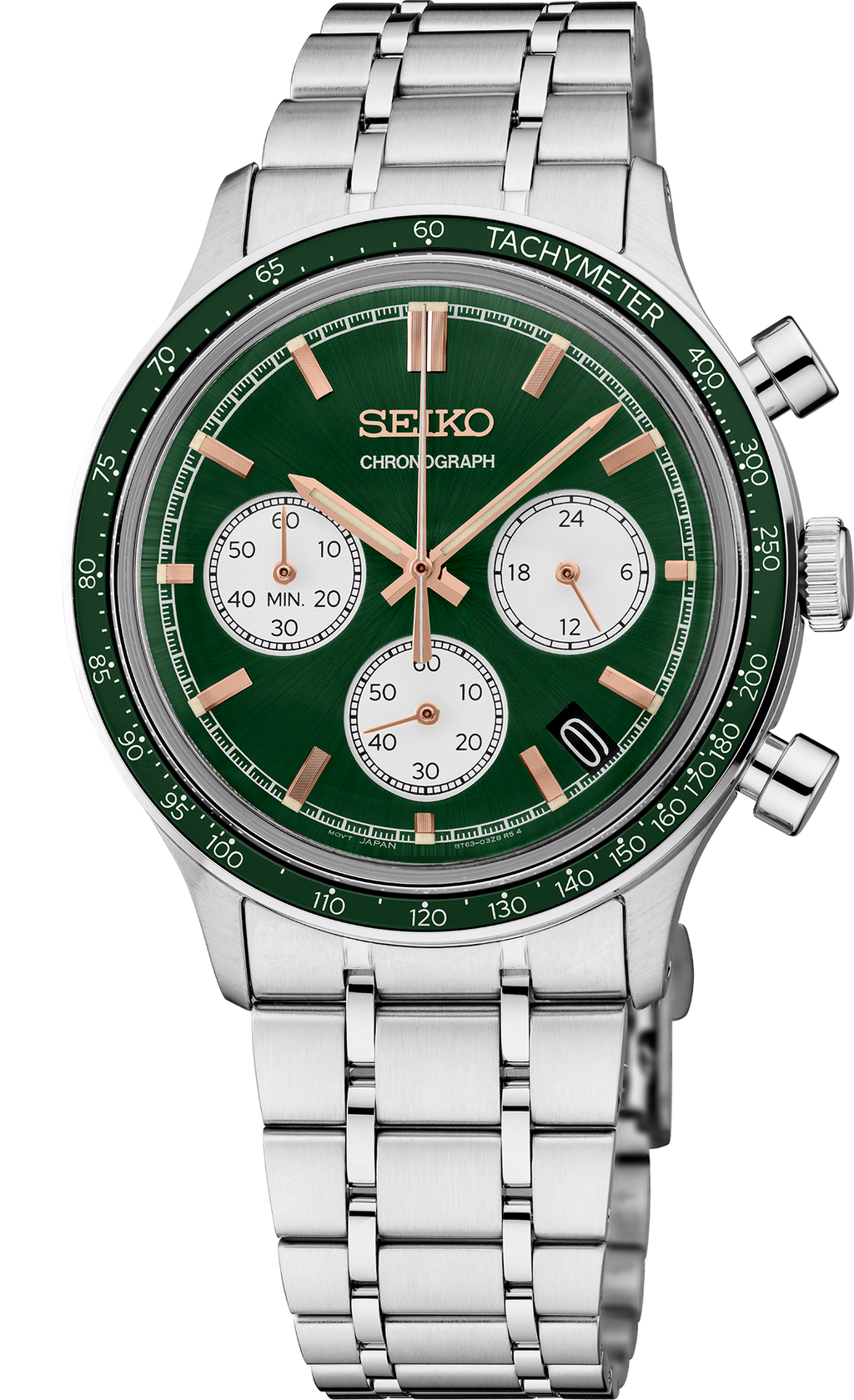 From the Essentials Collection. Inspired by motor sports, this dynamic chronograph features a Green dial with bold, highly legible white subdials at 3,6 and 9 o’clock styled to suggest a racecar instrument panel. Framed by a blue tachymeter outer ring, the dial also offers a date calendar as well a 24-hour subdial. The chronograph provides measurement of up to 60 minutes of elapsed time in 1/5-second increments. Crafted of stainless steel with mirror and hairline finish and tri-fold push button release clasp. 10 bar, 100M Water Resistant