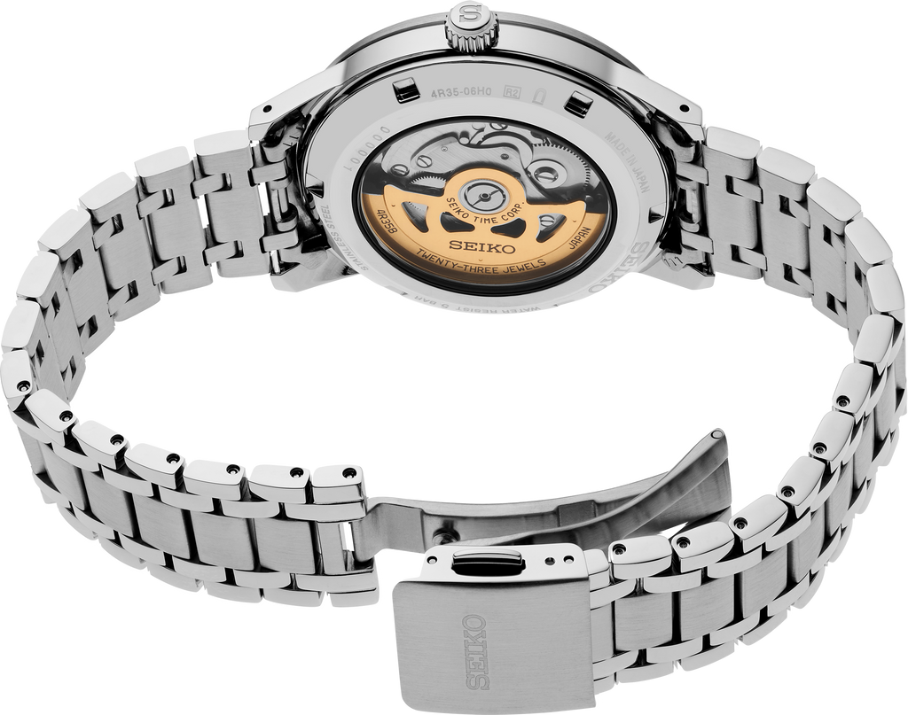 Presage Style60's Collection. Celebrating the fresh spirit of the 1960s, this design is an homage to Seiko’s 1964 “Crown Chronograph,” combining a bold ruggedness with a refined and tailored style. Framed by a coordinating metallic bezel, the multi-layer dial inherits the layout of the original model with a futuristic flair and a silver-violet color inspired by mid-century aesthetics. The faceted indices are polished for an elegant shine, enhanced by the stainless steel case and box shaped crystal, providing beautiful dimensionality. Visible underneath the screwdown see-through caseback, the 23-jewel automatic movement beats at a frequency of 21,600 vibrations per hour and offers manual winding capability with a power reserve of approximately 41 hours. Crafted of stainless steel, this versatile timepiece features a sophisticated multi-row bracelet, tri-fold push button release clasp, a date calendar and LumiBrite hands and markers for superior visibility. 5 bar, 50M Water Resistant