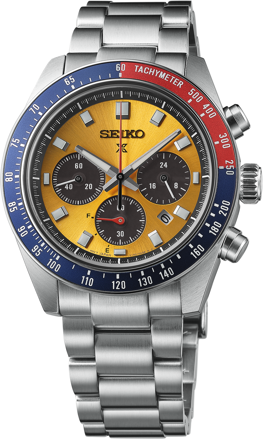 Seiko Speedtimer Solar Chronograph. Designed for those who treat life as the ultimate adventure, Seiko Prospex keeps moving forward, meeting every challenge with technological excellence and winning design. This rugged and stylish watch is part of a high-intensity collection inspired by the 1969 “Speedtimer,” the world’s first self-winding chronograph. Paying tribute to one of the first Speedtimer models, nicknamed by Seiko fans after a famous astronaut who wore the iconic original into space, this bold timepiece showcases a two-tone red and blue aluminum tachymeter bezel and a vibrant yellow dial with contrasting subdials. In a brilliant sunray finish, the dial also includes a 24-hour display, power reserve indicator, date calendar, and LumiBrite hands and markers. The chronograph function measures up to 60 minutes of elapsed time in 1/5-second increments and includes a split time function, while the solar cell, powered by any light source, with no battery change required, provides a 6-month power reserve when fully charged. Crafted of stainless steel, with a curved anti-reflective sapphire crystal and tapered three-link bracelet, this exceptional creation offers a secure screwdown caseback and a tri-fold push button release clasp. 10 bar, 100M Water Resistant